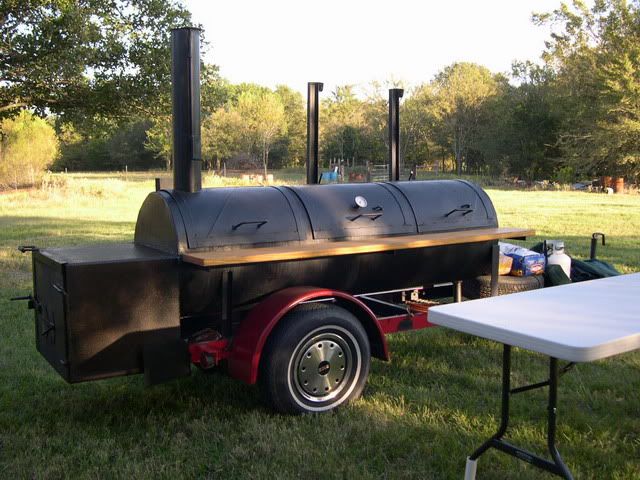 Heres my rig. Nothing big and nothing special but it cooks up some mean food. The firebox is a little small but you can make it work with some playing. The tuning "plates" in it are made from 5x10x1 fire bricks and the inside of the firebox is brick lined. The main tank is an old boiler tank that is 22"x46" and 3/16 thick.