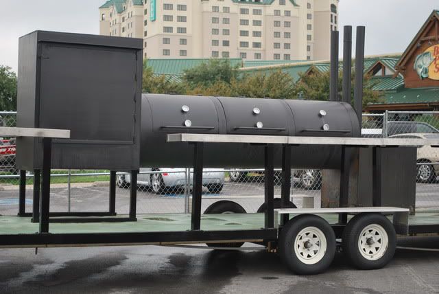 | JamesB wrote: | This one is not mine, it belongs to a buddy of mine and thought I would throw it in here too... He just finished it a couple of months ago and we used it last weekend to cook at the Camp Craig Allen fundraiser/BBQ Comp in Grapevine, Tx. It's pretty cool! It has externally adjustable tuning plates. It can be run as a regular offset or he can shut off the upright and run the main chamber as a reverse flow. There will be 3 or 4 burners put on the front for frying/boiling etc...
