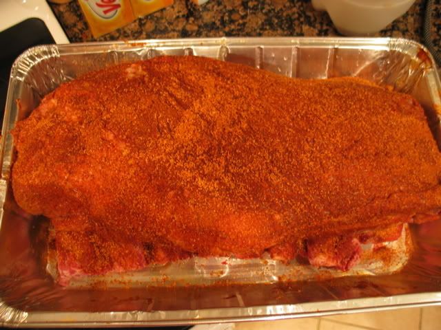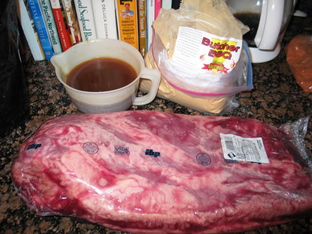Started out with a 13lb brisket, injected it with Butcher BBQ marinade and went by the directions on the package, let rest for 4 hours then added a mustard slather and dry rub.