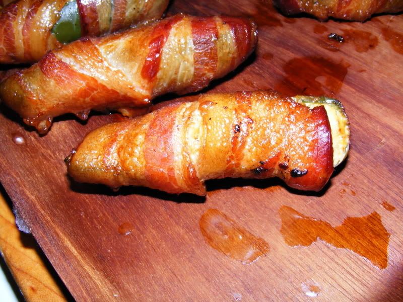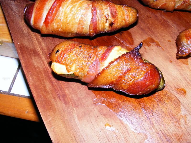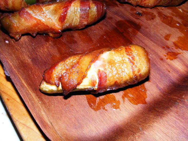 In the other smoker I smoked a St Louis rack along with 2 bacon wrapped chicken breasts that I stuffed with a 4 cheese herb mixture and a mess of ABT's.
