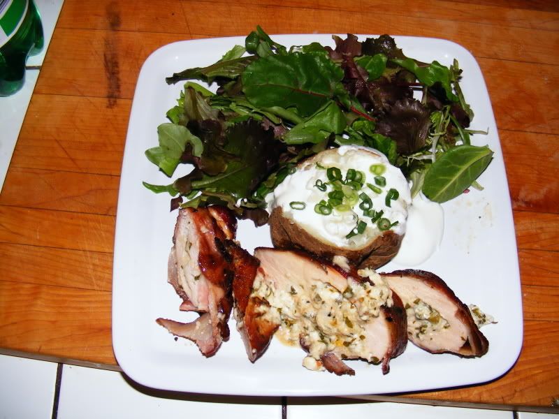 The stuffing started as left over ABT filling.. cream cheese and cheddar to which I added some goat cheese feta, some grated parm a few chopped green olives a chopped green onion some minced garlic, some fresh chopped basil and parsley, fresh cracked pepper and some butt rub.
