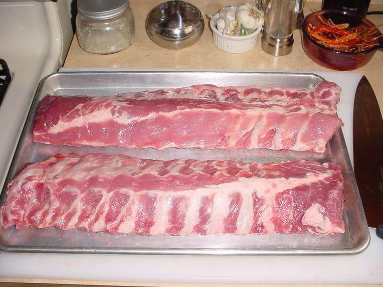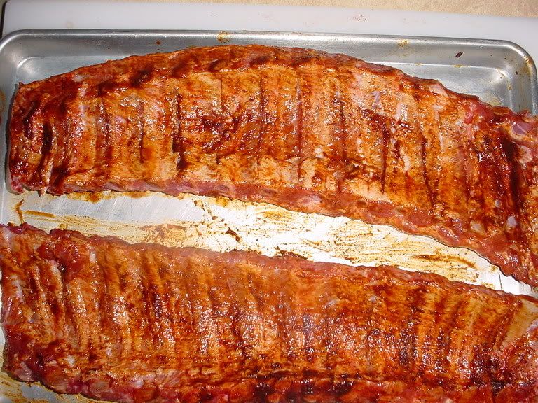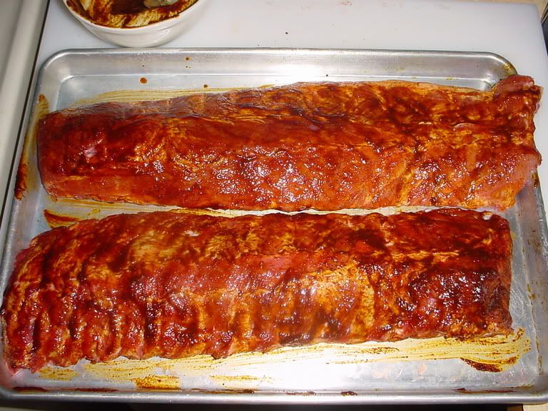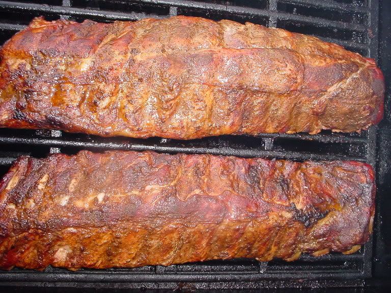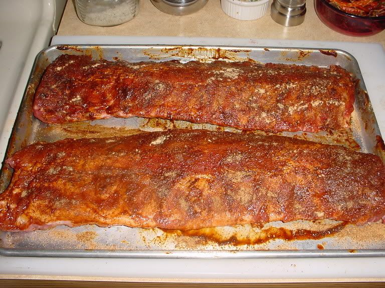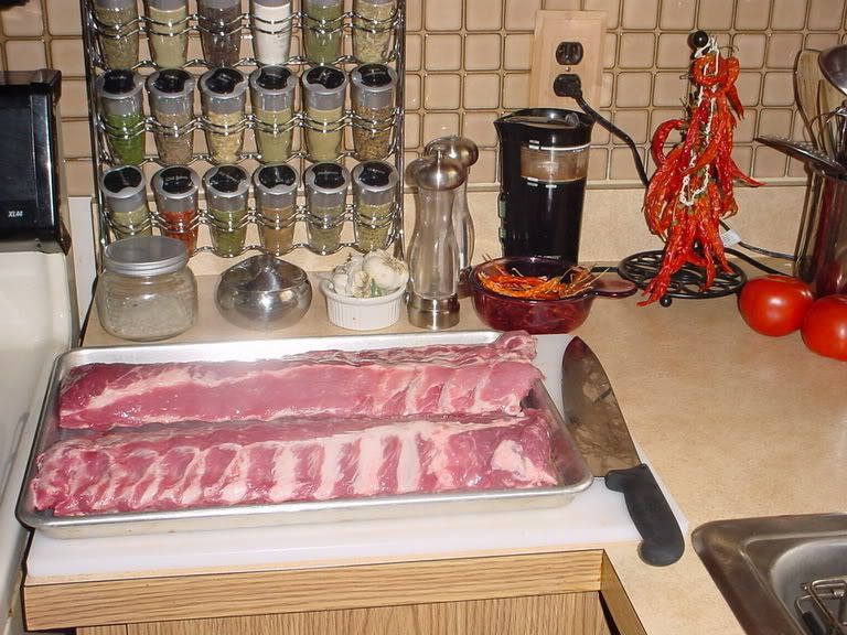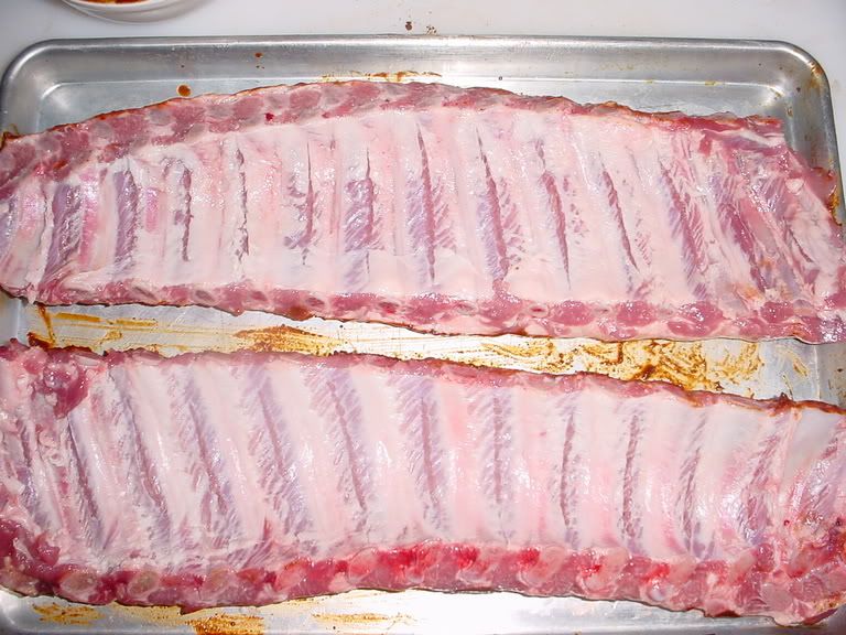Well I just got all my prep work done for todays feast. Like I said I'm trying the paste and dry rub combo on my BB's. The paste consists of Dark Brown Sugar, Ancho chili powder, Cumin, Minced Garlic (the jar stuff), Cayenne, Cider Vinegar, and Worcestershire, and the dry rub consists of Ancho, Paprika, Oregano, Garlic Powder, Cayenne, Black Pepper, Mustard Powder, Thyme, Celery Seed. I figured I would only use sugar in the paste and not the dry rub.