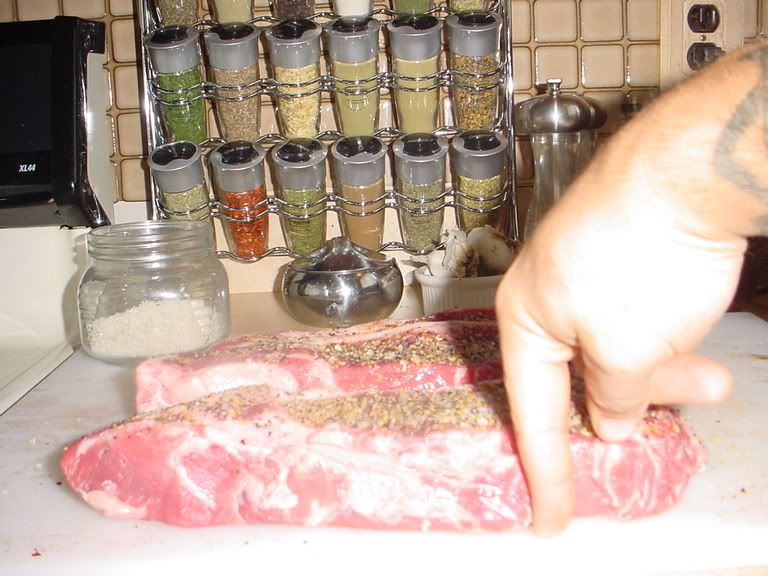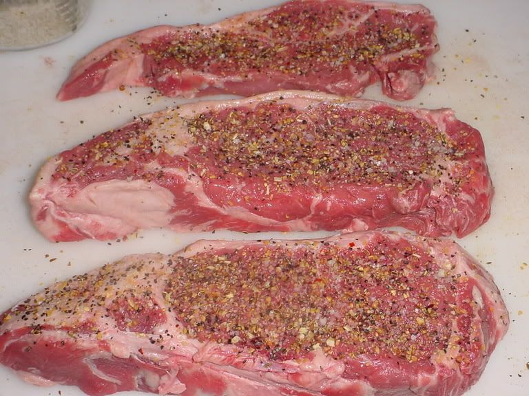 The NY Strips I use a combo of chopped garlic, chopped onion, corriander seed, fennel seed, red pepper corns, black pepper corns, and course grey salt... I grind them very course in the grinder and pat it on.