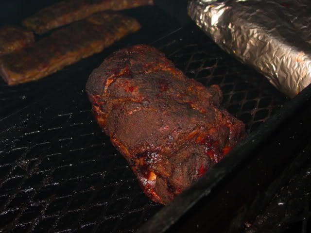 I didnt get any pics of preppin' the brisket or butt cuz I was in a hurry. I'll post the slather recipe in the rub/sauce/slather section. The rub I used on the pork was just greek seasoning(Cavender's) and cayenne. Was really pleased with the flavor considering how easy it was. _________________ Mike