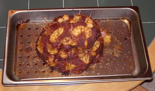 When we do hams, they go in with only cloves, and get basted with apple cider, when done (165 internal) we pull them out of the cooker, sprinkle on our dry glaze mix, hit it with the weedburner torch to carmelize it, add the pineapple and cherries, then sprinkle some more glaze powder (Sugar, Ginger, Maybe some clove powder) and hit it again with the torch to get some color on the fruit too. _________________ Just remember that the toes you may step on during your climb to the top will also be attached to the a$$es you'll be forced to kiss on your way back down! |
