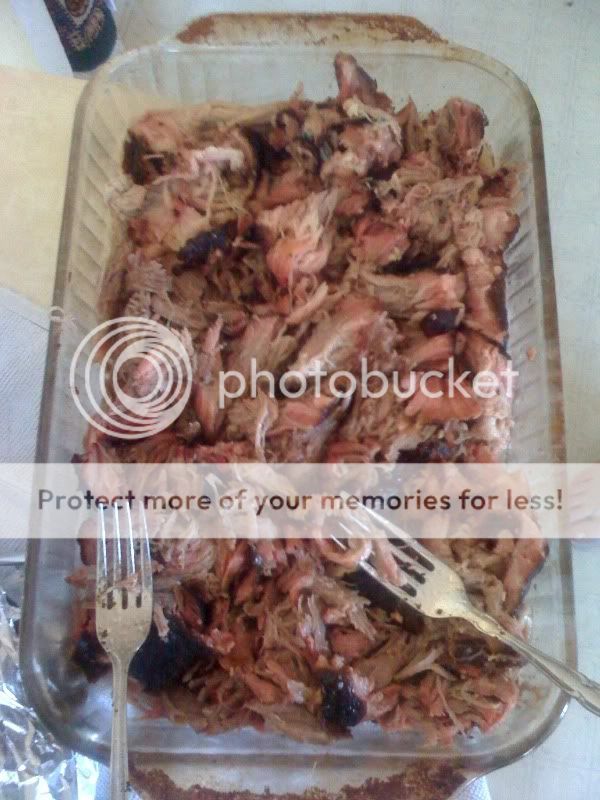 alright.... here's the final picture before the family attacked it.... i had planned to get a before pulling photo but when I transferred it to the pan it fell apart. So here is the pulled picture.....