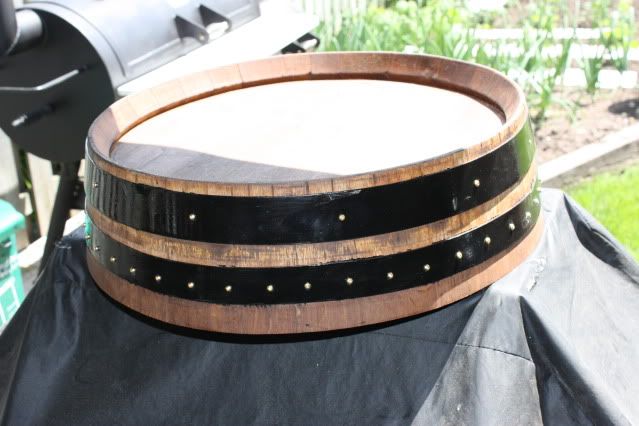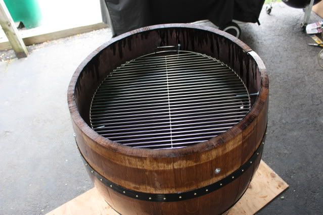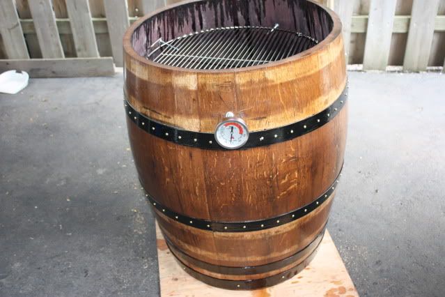 Finally got my whiskey barrel,and went right to town building my UDS.I have a 22 inch cooking grate in it.I mounted a good Tel Tru therm at grate level,I have almost 10 inches of clearance from grate to top of lid.I sanded and cleaned this barrel all up,I stained it with cherry stain,tremclad on the straps ,drilled all the holes and threw in some screws to keep it all together.I give it a couple coats of clear varathane,I still have to assemble the charcoal basket and throw in some intakes.I will update when I'm finished.I am not going to hinge the lid,it is just as easy to lift it off with the handles I installed and looks a lot neater without trying to hinge it.