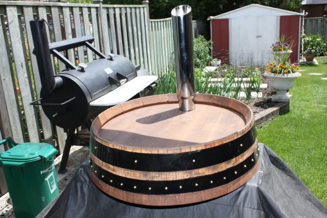 Thanks for all the compliments guys,I don't have any concerns at all about the barrel drying out.It has been restraped with new rings,because its done all the drying out and shrinking it's going to do.I screwed every stave to the rings.Once I start cooking in it,it's going to get moisture and grease all through it,just like moisturizing cream.This barrel has been sitting dry for over a year already with no signs of any kind of shrinkage.I will let you guys know if it starts falling apart after a couple cooks.  _________________ Horizon Offset (Marshall RD Special)
