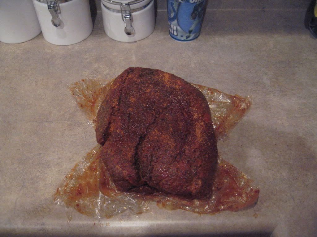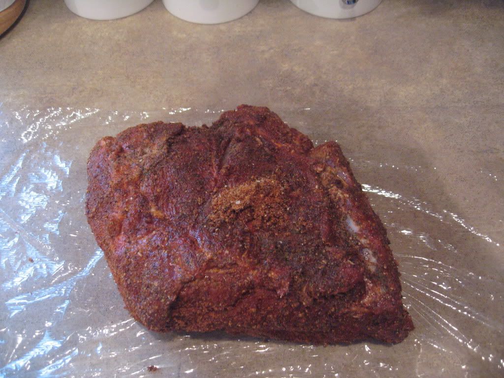 • 6:00pm - mustard slather and applied pork rub. Wrapped in cling wrap and placed in the fridge.
