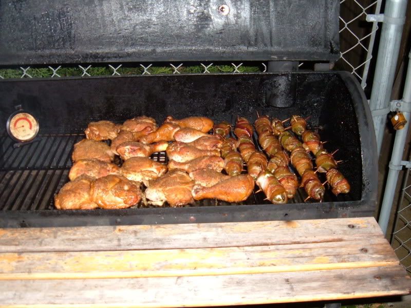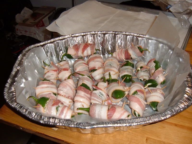 Whole deseeded deveined jalapenos stuffed with chopped smoked string cheese, chopped cherries, finely chopped onions, wrapped in bacon and dusted with a little rub.