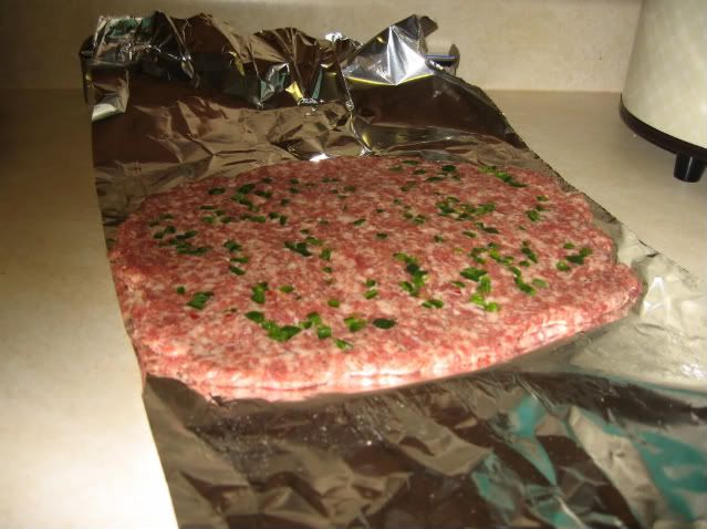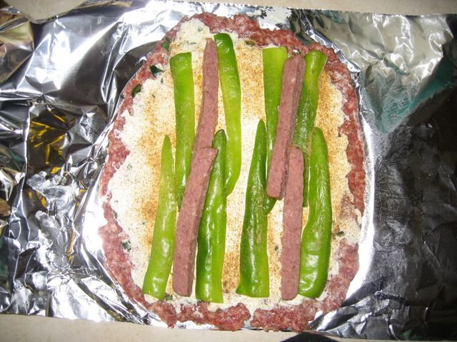 Rolled 1 JD Reg and 1 JD Italian sausage out, sprinkled both with bread crumbs, one layer meunster cheese (too mild), thawed hash browns, sauted onions and bell pepper.
