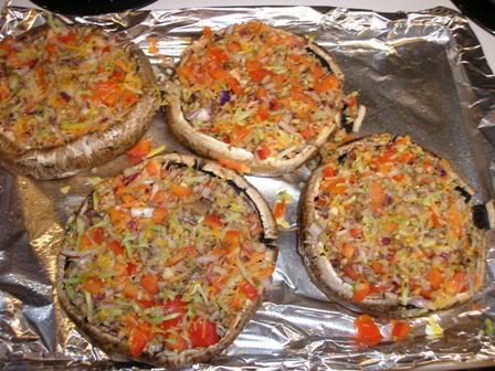 These are stuffed with red onion, brocolli slaw, 4 cheese mix, red bell pepper, minced garlic and olive oil.
