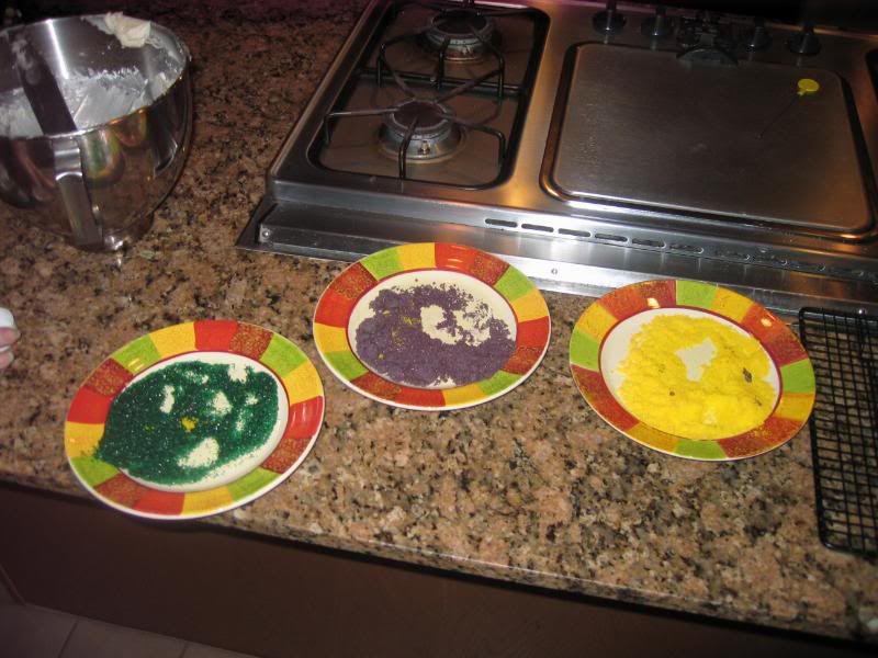 Never found yellow sugar or purple sugar, so my wife made her own using food coloring.