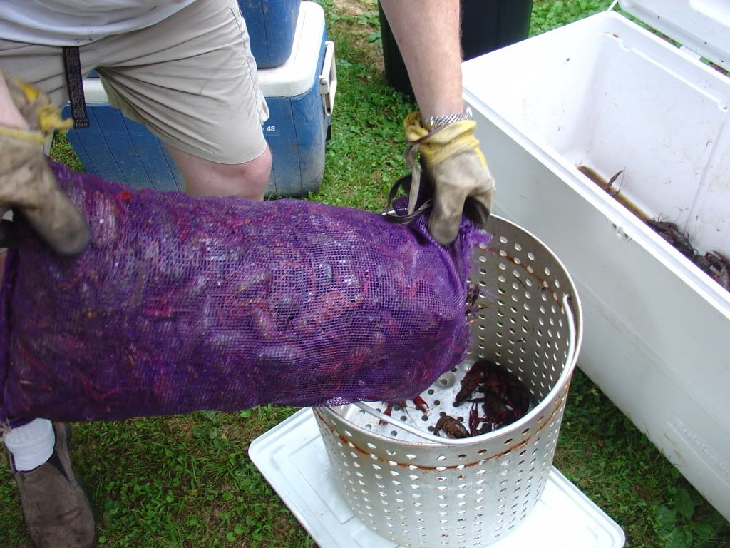 The big 60 quart pot is about ready with the first load of crawfish. This will be dumped in the hot chest with the already done veggies/sausage, more spices mixed in at this point.