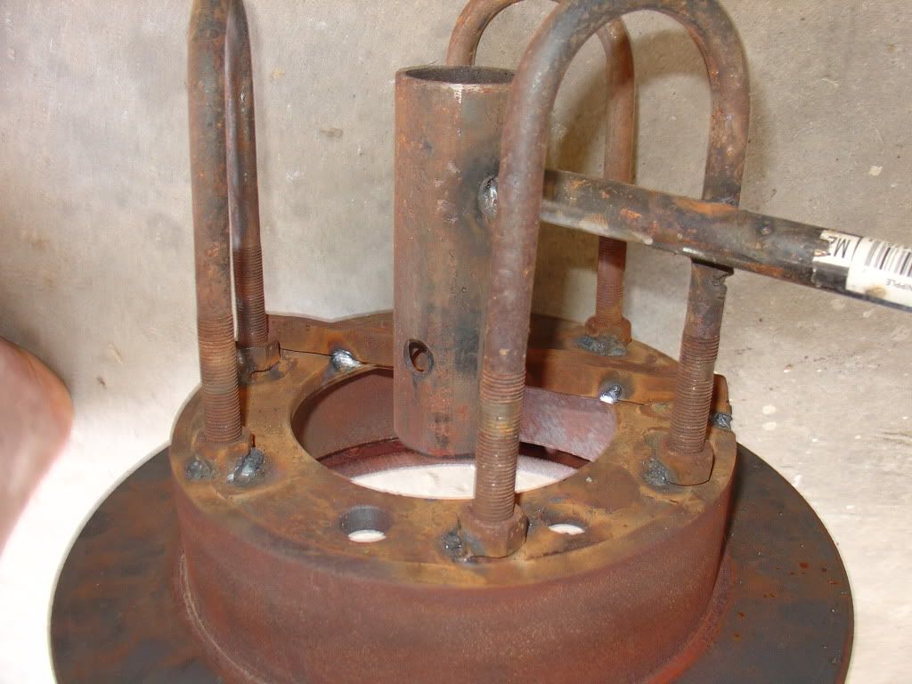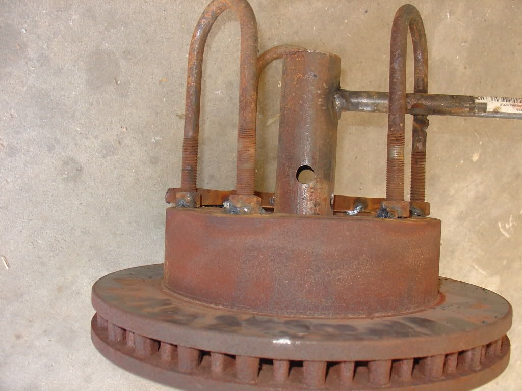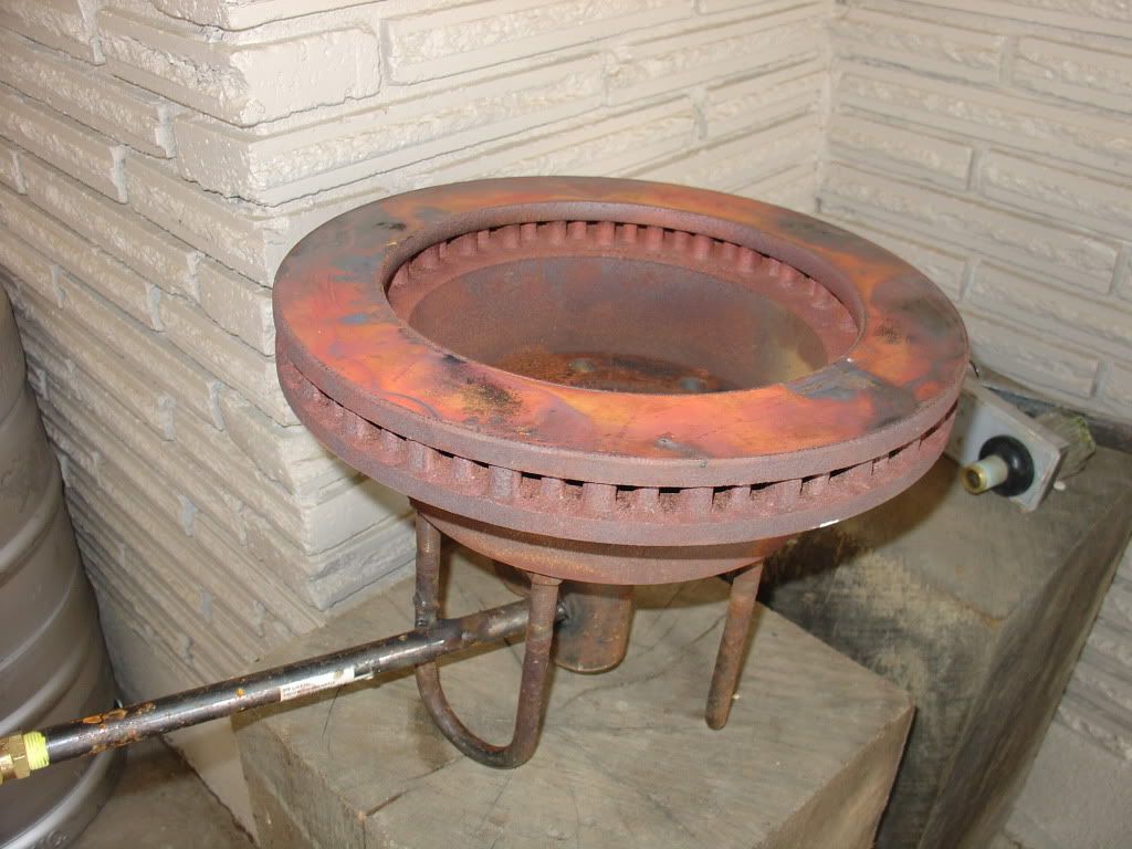 It is a rotor from an F-250 SuperDuty, it was actually on my Cajun friend's Ford two days before we built the cooker, lol. I'm not the brains behind the build, but basically the burner is a 12inch long pipe 3/8 pipe nipple capped on one end with one small hole drilled into the cap (I'm guessing an 1/8 inch bit or close to it). The second part was a piece of pipe about 1 and 1/2 inch diameter (not critical b/c I've seen him build same burner with different size pipes) with holes drilled for airflow. I approximated 1/2 inch from the end of the pipe and drilled completely through the pipe with a large bit (at least 5/ , then another set of holes the same way another 1/2 inch up, then we cut the end of that pipe off on the cutoff saw. This pipe was about 6inches in length. One more whole is drilled to insert the nipple burner through and weld together. This burner assembly was welded inside the rotor. Precise measurements were not used, Stiles welded everything by eye. I will take some close-up measurements of the burner assembly tomorrow and post them, because I know my description sounds confusing. Without the pot on the flame shoots straight up in the air,,,when the pot sits flat on the rotor the flame hits across the bottom of the pot and then diverts out through all the flutes in the rotor. I'm guessing the regulator is a high flow (Sounds like a jet engine!), it's one my buddy ordered then we used quickconnect parts for ease of use. Thanks for looking