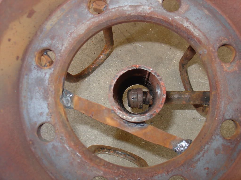 Top View Closeup: Here you can see the small hole drilled inside the 3/8 pipe nipple cap. Also how the tube is welded to the rotor by a bracket. Very simple, 3 quick welds.