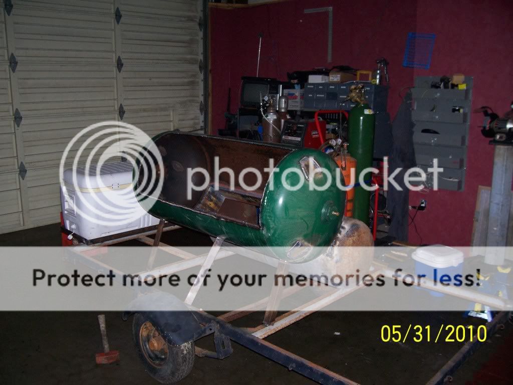The firebox was going to be 48 x 24 x 24 with a 4 x 6 opening into the cooking chamber. I know it is somewhat big for that size cooker but I have an opening in my trailer that size. Should I go with shorter dims to reduce costs? Or find a small 60 gallon LP tank to use a firebox. I also was thinking of using Old beer kegs as a firebox, they are only 18 gauge but they are free.