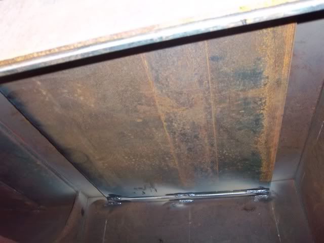 I also installed my sacrificial plate in the top of the firebox, it is hard to see but it is suspended 1/4" on the cooking chamber side and 3/4" on the far side giving me a slope to the opening. The plate is 3/8" thick.