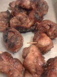 Moink Balls with a chipotle BBQ sauce (A Bottle of Stubbs with 3 chipotle peppers in adobo sauce and 1/2 cup of red wine)