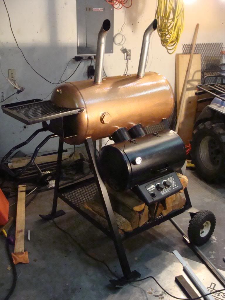 Hi, I am from southeast florida, I just finished building my first smoker. I had a friend of mine give me a 30gal compressor tank, then I added some 4-1/2 pipe, then the 11 gal air tank for the smoke box. I still need to finish painting it but it has has plenty of meat through it.