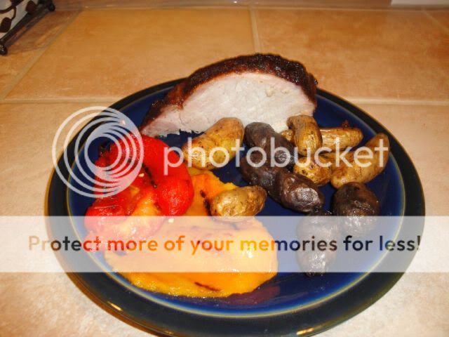 Here it is plated up with some roasted bell peppers and finger potatoes: