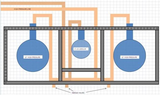 My thinking is to have two seperate lines, and have the high pressure lines tee off to two burners. I definitely like the thought of needle valve control mounted on the front.