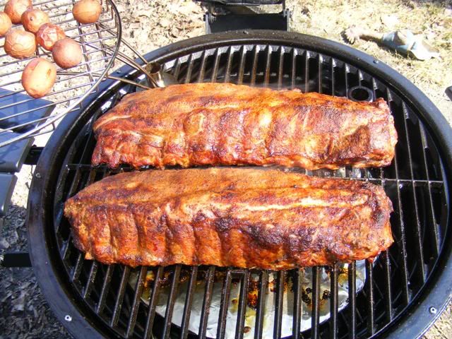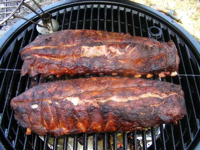 Shortly before they came off. I got to say I over cooked the ribs.. I was trying to go by time, a new cooker, and a cooker temp guage that I think is out by some. Guess it looks like I got to buy a new temp guage.. They tasted darn good but they were, to my shame, fall off the bone... There is my excuses..