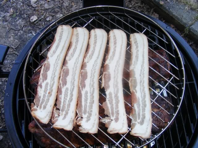 After the spuds came off I put a few rashers of bacon up top to kinda act as a baste as they smoked up.