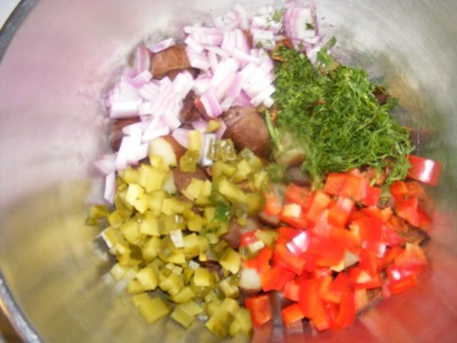 To the smoked baby red skins I added the chopped bacon, red onion and pepper, a couple pickles and fresh chopped dill. The dressing was mayo, a dash or two of pickle juice, a squirt of mustard, some tobasco and cracked pepper.