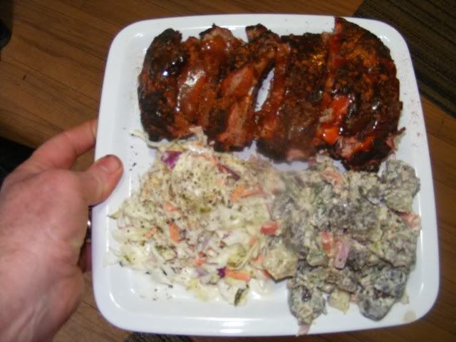 David, That is a fine plate up to be sure of. No shame in those ribs, I would work those over quicker than two gars could skin a minnow. Nicely done my man they look delicious.  _________________ Always remember slow and steady wins the race.