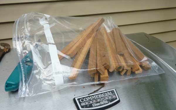 My stack of cedar kindling for the bottom of the basket. The cedar burns fast, just enough to get the charcoal going;